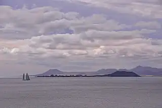 ![]() Estrecho de la Bocaina, Isla de Lobos (oscura) y Fuerteventura (al fondo). | ||