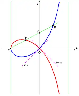 La curva se asemeja al folium de Descartes, y la recta es asíntota de las dos ramas infinitas. La curva posee dos asíntotasimaginarías más en el plano complejo, dadas por
