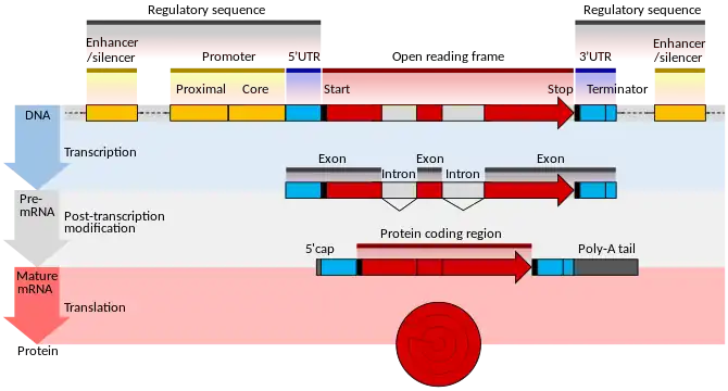 Se produce una capa adicional de regulación para los genes que codifican proteínas después de que el ARNm ha sido procesado para prepararlo para la traducción a la proteína. Solo la región entre los codones de inicio y parada codifica el producto proteico final. Las regiones no traducidas flanqueantes (UTR, del inglés flanking untranslated regions) contienen secuencias reguladoras adicionales.[17] El 3 'UTR contiene una secuencia de terminación, que marca el punto final para la transcripción y libera la ARN polimerasa.[18] El 5 'UTR se une al ribosoma, que traduce la región codificante de la proteína en una cadena de aminoácidos que se pliegan para formar el producto proteico final. En el caso de genes para ARN no codificantes, el ARN no se traduce, sino que se pliega para ser directamente funcional.[19][20]