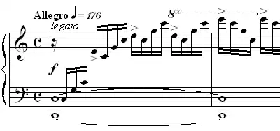La mano derecha debe hacer frente durante toda la pieza a extensos arpeggios de semicorchea en escalas que van modulando. La mano izquierda, por su parte, toca la grave melodía en lentas y monótonas octavas.