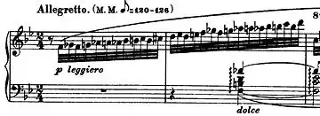 Emplea una gran cantidad de recursos pianísticos, entre las que cabe destacar rapidísimas notas dobles en la mano derecha. Las indicaciones pianissimo en las frases de notas dobles se oponen firmemente al deseo e incluso a la intuición del intérprete de tocarlas forte.