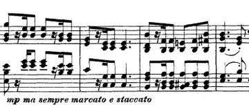 Los saltos amplios al principio abarcan unas tres octavas en la mano derecha. La sección central lírica implica algunos saltos difíciles con la mano izquierda que se extienden rápidamente a lo largo de dos octavas. El final implica una sección briosa y difícil de saltos de octava en la mano derecha que abarcan tres octavas. La pieza termina en una ráfaga de acordes descendentes.