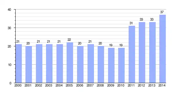 | Gráfica de evolución demográfica de Etuláin entre 2000 y 2014 |