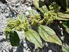 Es una planta herbácea anual, erecta o decumbente, o bien, rastrera y extendiéndose radialmente, densamente pilosa, los pelos con frecuencia multicelulares y amarillos. Alcanza los de 50 cm de largo. El tallo es ramificado en forma dicotómica. Las hojas son opuestas, estípulas pequeñas, en forma de aristas, pecíolos de 1 a 2 mm de largo, láminas ovadas a oblongo-lanceoladas, asimétricas, de 0.4 a 4 cm de largo por 0.3 a 3 cm de ancho, ápice agudo, borde comúnmente aserrado, base marcadamente oblicua, haz poco pubescente, con frecuencia con una mancha de color rojo oscuro en el centro, envés bastante pubescente, la diferencia entre ambas caras suele ser marcadamente manifiesta.