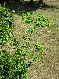 Como muchas plantas diferentes del género Euphorbia, produce una resina blanca o látex, conocida vulgarmente como "leche", que da los nombres vulgares o comunes de lechetrezna, o lechera a las plantas de esta familia. Este líquido se conoce con el nombre de euforbi y contiene el alcaloide euforbina que es tóxico y puede irritar la piel y los ojos severamente.[4]