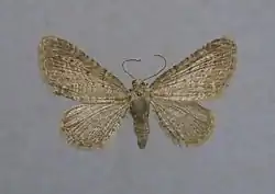 Es una polilla pequeña con una envergadura de 18 a 22 milímetros (0,7 a 0,9 plg) y de color marrón claro.[3] Tiene similitud con una versión ocre de E. satyrata. Los adultos vuelan desde mediados de mayo hasta finales de julio.[4]