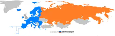 El "eurasianismo" ruso correspondía inicialmente más o menos a la superficie terrestre de la Rusia Imperial en 1914, incluyendo partes de Europa Oriental.[24] Uno de los principales intereses geopolíticos de Rusia reside en una integración cada vez más estrecha con aquellos países que considera parte de "Eurasia".[25] Este concepto se integra además con la escatología comunista por el autor Alexander Dugin como el principio rector de la "autosuficiencia de un gran espacio" durante la expansión.[26]