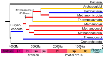 El análisis filogenético proteico también sugiere que la metanogénesis es muy antigua, pues tendría casi 3500 millones de años, obteniéndose el siguiente cladograma:[4]