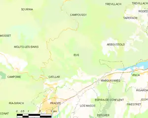 La comuna de Eus limita con Sournia, Campoussy, Arboussols, Marquixanes, Los Masos, Prades, Catllar y Molitg-les-Bains.