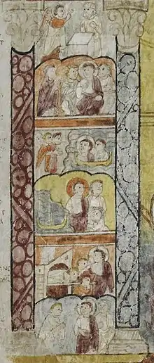En contraste con las escenas alrededor del retrato, todas estas escenas, excepto Cristo llevado ante Pilato, debían seguir siendo muy comunes en grandes ciclos narrativos a lo largo de la Edad Media y más allá. La dificultad de identificar muchos de los episodios de las Obras de Lucas demuestra una de las razones por las cuales las escenas del período del ministerio de Cristo se hicieron cada vez menos comunes en el arte medieval. Otra razón para esto fue la falta de días festivos para celebrarlos. Las dos escenas en la parte superior de la columna central en la página Pasión, en contraste, aparecen en el set de lectura del evangelio para el Jueves Santo, y la mayoría de las escenas en esta página se identifican fácilmente. La resurrección de Lázaro, con el cuerpo en su tela blanca sinuosa, fue un milagro que se reconoció fácilmente en las imágenes y permaneció en el repertorio habitual de artistas. La mano de Dios en la agonía en el jardín es el primer ejemplo sobreviviente del motivo en esta escena.