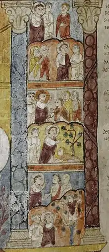 - El milagro del hijo de la viuda de Naim, (izquierda, 5º abajo, Lucas 7, 12–16) en la "puerta de la ciudad".