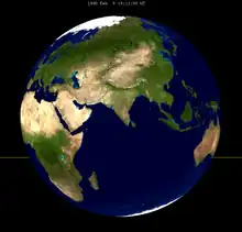 Esta animación es de toda una serie saros ocurrida al mismo tiempo de los exeligmos mostrados arriba. Observe cómo cada eclipse cae en un lado diferente de la tierra (120 grados de separación).[7]
