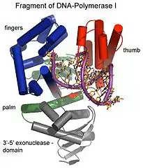 Luego, la Pol I coloca nucleótidos de ADN en el lugar ocupado por el iniciador de ARN que acaba de ser removido. La polimerasa de ADN I también posee actividad exonucleasa 3' a 5', la cual es utilizada en la edición y en el mecanismo de corrección de errores del ADN.
