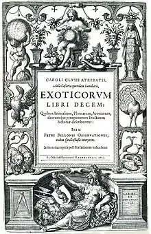 En la portada el nombre del autor aparece en su famosa forma latina Carolus Clusius. El título completo es: Exoticorum libri decem, quibus animalium, plantarum, aromatum, aliorumque peregrinorum fructuum historiae describuntur ("Diez libros de exotismo: la historia y usos de los animales, las plantas aromáticas y otros productos naturales de tierras lejanas").