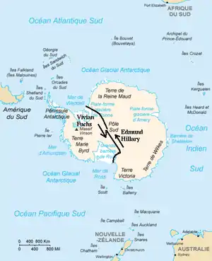 - Esta obra contiene una traducción derivada de « Expédition Fuchs-Hillary» de Wikipedia en francés, publicada por sus editores bajo la Licencia de documentación libre de GNU y la Licencia Creative Commons Atribución-CompartirIgual 4.0 Internacional.