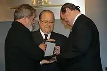 ![]() Expedito Parente (derecha) recibiendo un homenaje del entonces presidente Lula (izquierda) en 2006. | ||