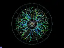 Se emitieron hasta 3.000 partículas cargadas de cada colisión, que se muestran aquí como líneas que irradian desde el punto de colisión. Los colores de las líneas indican cuánta energía extrajo cada partícula de la colisión.