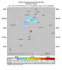 - Servicio Geológico de Estados Unidos. «Magnitud 2.1 – Centro de Texas» (en inglés). Consultado el 4 de mayo de 2016.