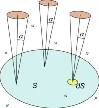 Teniendo en cuenta que dΩ se expresa en coordenadas esféricas, si una superficie grande S es atravesada por (o emite) luz también confinada a un cono de ángulo α, la extensión del haz de luz S es