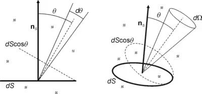 Un elemento de superficie infinitesimal, dS, con su normal nS está inmerso en un medio de índice de refracción n. La superficie es atravesada por (o emite) luz confinada en un ángulo sólido, dΩ, en un ángulo θ con respecto a la normal nS. El área de dS proyectada en la dirección de la propagación de la luz es dS cos θ. La extensión de este cruce de luz dS se define como