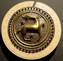 La fíbula es una estructura de varias capas. Su cara consiste en un disco de plata muy fino, dorado al fuego y contorneado, con un diámetro de 58 milímetros. Este disco está fijado con tres remaches de plata a una placa de cobre del mismo tamaño, de 3 milímetros de grosor, y junto a ella a una placa de plata más resistente. La placa trasera, de 78 milímetros de diámetro, es bastante más grande. En su parte trasera se montó el pasador. El reverso de la placa delantera se rellenaba con una mezcla, ahora de color verde blanquecino, de estaño, plomo y trazas de cobre, para soportar el sensible trabajo de fricción y evitar el prensado de los ornamentos accionados. Pero los componentes de estaño del relleno han dañado algunas de las partes metálicas de la decoración debido a los procesos alotrópicos forzados por las bajas temperaturas durante el almacenamiento a largo plazo en el suelo (peste del estaño). La decoración consiste en un animal cuadrúpedo que camina hacia la derecha, con la cabeza del animal mirando hacia atrás. Tiene dos orejas y una lengua que sobresale. Alrededor del cuello lleva un adorno en forma de collar. Las patas están colocadas debajo del cuerpo para acomodar la forma redonda del disco. El fondo está decorado con impresiones distribuidas irregularmente, imitando una granulación. La escena está enmarcada por dos bandas acanaladas, que están delimitadas por una corona ornamental y otra banda acanalada. Alrededor del cuerpo del animal hay tres cabezas de remaches en forma de roseta. El cuerpo del animal tiene un gran defecto causado por el relleno de estaño degenerado. Algunos de los bordes que sobresalen de la placa de montaje trasera están rotos. Debajo de la placa de cobre se encontraron cantidades residuales de material orgánico, que se interpretaron como marfil.[7] Debido a las comparaciones tipológicas de los ornamentos, la fíbula se dató hacia el año 300.[7]