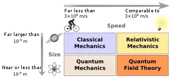 En términos generales, las leyes de la física clásica describen con precisión sistemas cuyas escalas de longitud importantes son mayores que la escala atómica y cuyos movimientos son mucho más lentos que la velocidad de la luz. Fuera de este ámbito, las observaciones no coinciden con las predicciones de la mecánica clásica. Einstein aportó el marco de la relatividad especial, que sustituyó las nociones de tiempo y espacio absolutos por las de espaciotiempo y permitió una descripción precisa de los sistemas cuyos componentes tienen velocidades cercanas a la de la luz. Grandes físicos contemporáneos de Albert Einstein, como Planck, Schrödinger y otros, introdujeron la mecánica cuántica, una noción probabilística de las partículas y las interacciones que permitió una descripción precisa de las escalas atómica y subatómica. Posteriormente, la teoría cuántica de campos unificó la mecánica cuántica y la relatividad especial. La relatividad general permitió un espaciotiempo dinámico y curvo, con el que se pueden describir bien los sistemas altamente masivos y la estructura a gran escala del universo. La relatividad general aún no se ha unificado con las otras descripciones fundamentales; se están desarrollando varias teorías candidatas de gravedad cuántica por el momento.