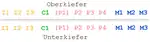 Tómese como ejemplo la siguiente representación de la dentición humana, que en total está compuesta por 8 incisivos, 4 caninos, 8 premolares y 12 molares; al considerar solo un semiarco maxilar y un semiarco mandibular, se obtiene: