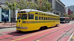 ![]() Coche 1057, uno de los tranvías PCC de dos extremos originales de San Francisco, pintado con los colores de Cincinnati Street Railway Company. | ||