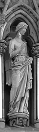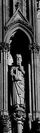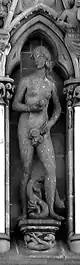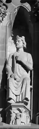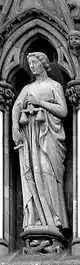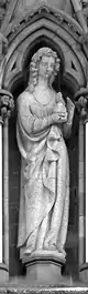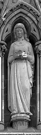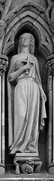 | En el lado derecho del rosetón hay tres esculturas con forma femenina, que representan a las tres virtudes teologales. Estas virtudes fundan, animan y caracterizan las obras morales cristianas. Las virtudes teologales se relacionan con las cuatro virtudes mundanas situadas al otro lado del rosetón de la catedral. | |||||||