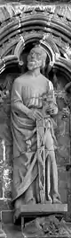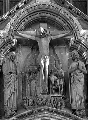Desde el centro se extienden las esculturas hacia cada lado. La hilera superior contiene las imágenes de los antepasados de Cristo. La hilera central muestra la expulsión del Paraíso y la Anunciación, a ambos lados del rosetón, así como santos y sus virtudes. La hilera inferior muestra a los apóstoles, junto con santos y reyes que difundieron el cristianismo en Europa.