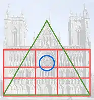 Helge Thiis propuso que la fachada debía ser construida siguiendo un sistema de proporción rítmica: «Las estatuas sedentes de reyes y profetas en la hilera superior tienen la misma altura que la hilera inferior, mientras que sus nichos tienen la misma altura que la hilera intermedia. La altura de la hilera superior, desde la cornisa hasta la cima de los arcos de los nichos, es idéntica a la altura de la parte inferior, desde el nivel del piso hasta la cima de las esculturas de la hilera inferior.» La línea fundamental de la fachada-pantalla rectangular se formó de acuerdo a los principios del número áureo. Las dos columnas a cada lado del rosetón estás colocadas de acuerdo a ese principio, lo mismo que la disposición de las líneas horizontales entre la primera y la segunda ventana y entre la tercera y la cuarta. La línea fundamental del rectángulo de la fachada forma también la línea fundamental de un triángulo isósceles cuyo ángulo superior coincide con el piñón de la fachada. El rosetón forma un círculo dentro del triángulo. Un círculo en un triángulo isósceles es considerado frecuentemente como un símbolo de «el ojo de Dios».