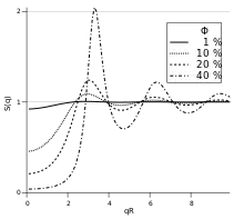 A diferencia de los cristales, la materia en estado líquido no posee orden de alcance largo, por lo que el factor de estructura no exhibe los picos discretos que caracterizan a la difracción por cristales. Sin embargo, los líquidos tienen un cierto grado de orden de corto alcance, que depende de su densidad y la magnitud de la interacción entre sus partículas conformantes. Como los líquidos son isotrópicos, el factor de estructura solo depende del módulo del vector y no de su dirección.[4] Si en la expresión general para el factor de estructura se separan los términos diagonales , cuya fase es 0 y son por tanto iguales a la unidad se obtiene: