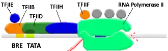 El complejo de pre-iniciación de la transcripción es un gran complejo de proteínas que es necesario para la transcripción de genes que codifican proteínas en eucariotas y arqueas. Forma un complejo con el promotor del ADN (por ejemplo, la caja TATA) y ayuda a estabilizar la ARN polimerasa II en los sitios de inicio de la transcripción del gen, desnaturalizando el ADN y permitiendo a continuación el comienzo de la transcripción.[7][16][17][18]