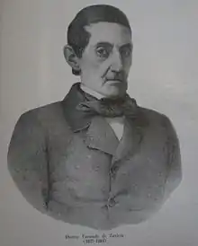 - Julio de Zuviría Lezama[8][9] (ib., 9 de julio de 1825 - pueblo de Belgrano, 15 de octubre de 1877) era un liberal y doctor en jurisprudencia que fue nombrado diputado nacional representando a su provincia en el período de 1862 a 1866. Estaba enlazado desde el 30 de diciembre de 1864, en la iglesia de la Inmaculada Concepción de Buenos Aires, con Trinidad del Corazón de Jesús Ferré Igarzábal (n. Corrientes, 11 de junio de 1849) —una descendiente de catalano-españoles de principios del siglo XIX y de hispano-correntinos coloniales de siglos anteriores— y con quien tuviera solo una hija documentada: María Dolores de la Trinidad Zuviría Ferré (n. Buenos Aires, 17 de agosto de 1866).