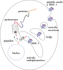 La presentación de antígeno es un proceso en el cual algunos fagocitos redirigen partes del material fagocitado a su superficie celular y lo «presentan» a otras células del sistema inmunitario.[55] Existen dos células presentadoras de antígeno «profesionales»: los macrófagos y las células dendríticas.[56] Tras su inclusión en el fagocito, las proteínas no propias (los antígenos) son degradados en péptidos en el interior de las células dendríticas y los macrófagos. Estos péptidos se unen a las glicoproteínas del complejo mayor de histocompatibilidad (MHC) de la célula, que los exponen en la superficie de los fagocitos, dónde pueden ser «presentados» a los linfocitos.[17] Los macrófagos maduros no se alejan demasiado del lugar de infección, pero las células dendríticas pueden llegar a los nódulos linfáticos, donde hay millones de linfocitos.[57] Esto mejora la inmunidad, puesto que los linfocitos responden allí a los antígenos presentados por las células dendríticas igual que lo harían en el lugar de la infección original.[58] Aun así, las células dendríticas no colaboran siempre con los linfocitos, y pueden destruirlos si es necesario, para proteger el cuerpo. Esto ocurre en un proceso denominado tolerancia.[59]