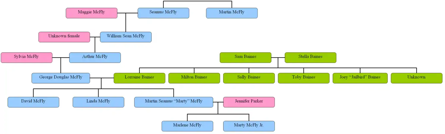 El árbol de la familia McFly, incluidos todos los miembros de la familia, mencionados en las películas, por lo tanto, puede extraerse como tal: