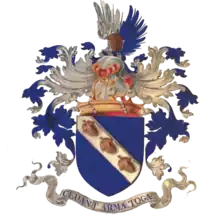 Corona: de caballero coronado por un yelmo plateado a la parrilla, con cuello y ribete dorado.