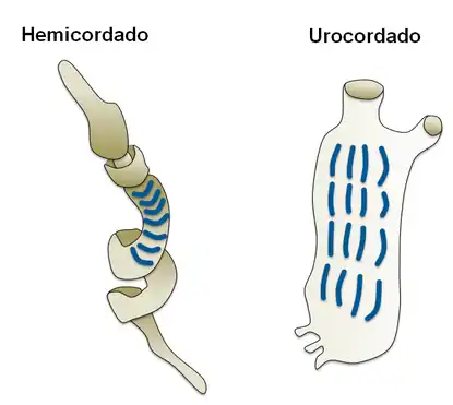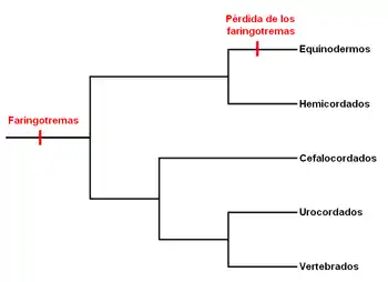 La presencia de faringotremas en hemicordados llevó a debates sobre si éstas eran homólogas a las hendiduras encontradas en los cordados, o eran el resultado de evolución convergente.[8] Con el posicionamiento de los hemicordados y equinodermos como grupos hermanos de los cordados han surgido hipótesis que sugieren que los faringotremasse encontraban presentes sus antepasados deuteróstomos.[9] Extrañamene algunos taxones extintos de equinodermos no poseen estructuras faríngeas, aunque la evidencia fósil revela que los antepasados de os equinodermos poseían estructuras similares a las agallas.[10] En análisis genético y comparativo del desarrollo de estas estructuras faríngeas entre los hemicordados y urocordados han revelado datos importantes sobre la evolución del plan corporal del deuteróstomo.[11] La biología molecular comparativa ha revelado que los genes PAX1/9 (que codifican los factores de trascripción) son expresados en patrones similares entre hemicordados y urocordados; En los vertebrados Pax 1 y Pax 9 son expresados en las bolsas faríngeas y son importantes en el desarrollo del timo.[12] De manera interesante, la aplicación de un exceso de ácido retinoico en vertebrados resulta en anormalidades faríngeas, y en el cefalocordado Branchiostoma lanceolatum resulta en la ausencia de faringotremas, sugiriendo que el ácido retinoico actúa con el mismo mecanismoen ambos.[13] Estos estudios indican que los faringotremas encontrados en hemicordados y cordados son homólogos desde un punto de vista molecular.