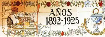 La decoración de los paneles publicitarios en el exterior del establecimiento se instaló hacia 1920. El principal artífice fue el ilustrador-pintor-ceramista Enrique Guijo, aunque en muchos de los paneles aparece la firma "Mardomingo" (¿Marcelino Domingo, Marcial Domingo, Mardomingo apellido?).[2][8] Se trata de grandes paneles policromados y con cenefas de "cuerda seca" en marcos de lacerías y otros recursos tradicionales, haciendo publicidad de distintos —además de curiosos y divertidos— remedios farmacéuticos relacionados con los males y enfermedades de la época (comienzos del siglo XX).[9][lower-alpha 1]