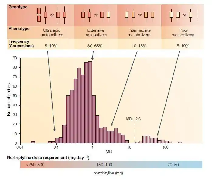 Sin embargo, dentro de una misma población también se dan variaciones. Un ejemplo lo constituyen los caucasianos, en relación con la capacidad de metabolizar la droga nortriptilina, un antidepresivo.