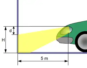 La imagen de la derecha y la tabla de abajo proporcionan una información que permite el control y reglaje de los faros de un coche. Esto se debe hacer sobre una superficie plana, con los neumáticos inflados correctamente y el vehículo con carga normal.