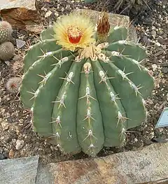 Ferocactus: nombre genérico que deriva del adjetivo latíno "ferus" = "salvaje" , "indómito" y "cactus", para referirse a las fuertes espinas de algunas especies.