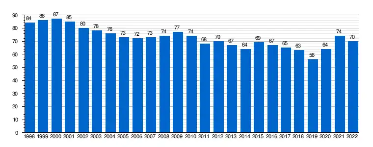 | Gráfica de evolución demográfica de Ferreruela de Huerva[6] entre 1998 y 2022 |