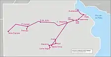 - Desde un punto situado en las inmediaciones de Brandsen, de la línea principal, después del cruce con el Ferrocarril del Sud y pasando por General Paz, Pila y proximidades de Labardén, hasta llegar a Mar del Plata, con un ramal a Ayacucho.