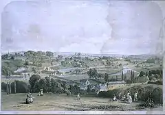 ![]() Exeter en 1844. La ilustración de William Spreat muestra la Estación de Exeter original antes de que se abriera el Ferrocarril del Sur de Devon | ||