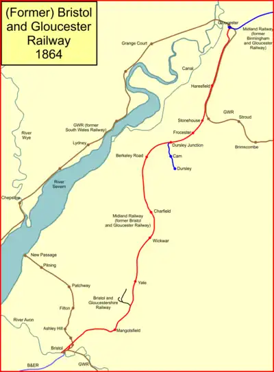 La ciudad de Dursley (Gloucestershire) se sintió en desventaja al quedar fuera de la red ferroviaria, y los intereses locales promovieron el Ferrocarril de Conexión de Dursley y Midland para tender un ramal corto desde Coaley en la línea de Bristol y Gloucester. Se inauguró el 18 de septiembre de 1856. La estación de conexión se llamó Dursley Junction al principio. Esta línea también estaba en una situación financiera difícil y vendió su empresa al Ferrocarril de Midland en 1860. Los servicios de pasajeros se retiraron en 1962. Una empresa de ingeniería en Dursley sostuvo la línea durante algunos años, pero cerró por completo en 1970.[25][4]