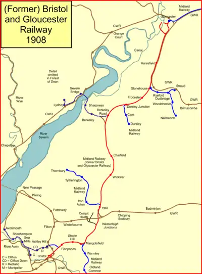 El Great Western Railway abrió una curva sur hacia el ramal de Sharpness en 1908, en conexión con la línea ferroviaria de Bádminton (descrita más adelante).[28]