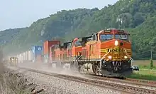 Los ferrocarriles estadounidenses siguen desempeñando un papel importante en el transporte de mercancías del país. En 1975 transportaron 750.000 millones de toneladas por milla, que se duplicaron hasta 1,5 billones de toneladas por milla en 2005.[21][22] En la década de 1950, Estados Unidos y Europa movían aproximadamente el mismo porcentaje de mercancías por ferrocarril; en el año 2000, el porcentaje de mercancías por ferrocarril en Estados Unidos era del 38%, mientras que en Europa solo el 8% de las mercancías viajaban por ferrocarril.[23][24] En el año 2000, mientras que los trenes estadounidenses movieron 2.390 millones de toneladas de mercancías por kilómetro, la Unión Europea de 15 países solo movió 304.000 millones de toneladas de mercancías por kilómetro.[25] En términos de toneladas por milla, los ferrocarriles mueven anualmente más del 25% de la carga de Estados Unidos y conectan a las empresas entre sí en todo el país y con los mercados de ultramar.[21] En 2018, el transporte ferroviario de mercancías de Estados Unidos tuvo una eficiencia energética de 473 millas por galón de combustible por tonelada de carga.[26]