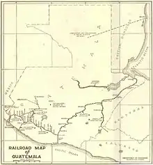 Otro ferrocarril aislado, Ferrocarril Verapaz (también conocido como Ferropazco ), solía conectar Panzós y Tucurú en el departamento de Alta Verapaz . Su construcción fue autorizada en 1884 y completada en 1895.[15] Su objetivo principal era transportar café desde fincas (fincas) controladas principalmente por alemanes hasta el puerto de Panzós en el río Polochic, que se fusionó con el Lago de Izabal y el Mar Caribe . La empresa fue nacionalizada en 1943.[16] En 1956, el gobierno creó una empresa nacional Ferrocarril Verapaz y Servicios Anexos .[17] Las operaciones a lo largo del Ferrocarril Verapaz y Servicios Anexos se detuvieron en 1963.