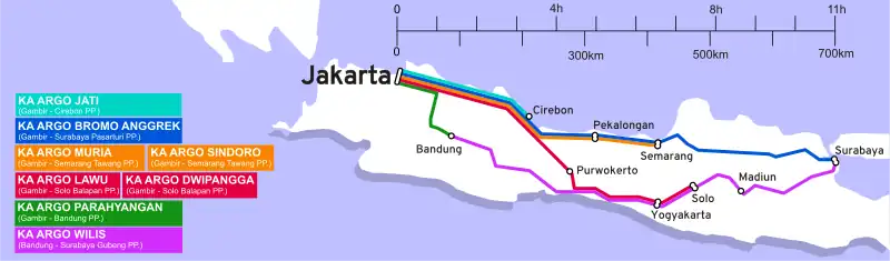 Nota: El K.A. Argo Gede ya no existe (y tampoco el K.A. Parahyangan). En sustitución, los trenes K.A. Argo Parahyangan realizan el mismo recorrido como una fusión de K.A. Argo Gede y K.A. Parahyangan.